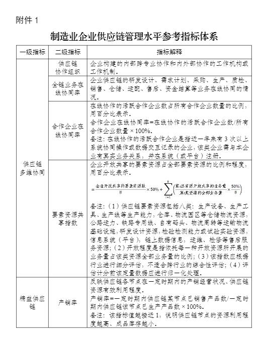 为贯彻落实《国务院办公厅关于积极推进供应链创新与应用的指导意见》、《“十四五”现代物流发展规划》等部署要求,加快实施制造业供应链提升工程,推动现代供应链体系深度嵌入制造业产业链,工业和信息化部、交通运输部、商务部组织编制了《制造业企业供应链管理水平提升指南(试行)》,现印发给你们。