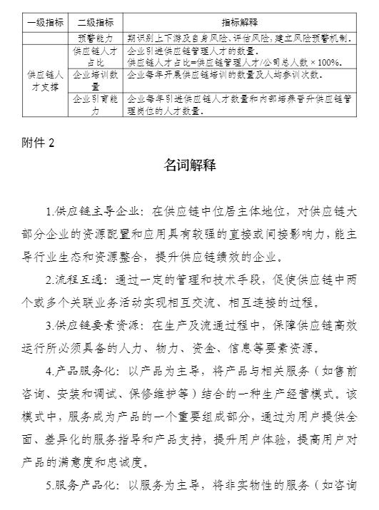 (二十三)强化标准服务支撑。推动现有已发布的供应链数字化管理、绿色供应链管理、供应链安全管理等领域系列标准导入企业供应链管理全过程,依据标准提升企业供应链管理水平。鼓励标准化组织、行业协会、社会团体、重点企业等围绕制造业企业供应链管理中新技术、新业态、新模式等建立标准和规范,加强标准宣贯、应用服务和实施效果评估,支撑企业建立标准化的供应链管理体系。鼓励行业协会、专业机构等参照制造业企业供应链管理水平参考指标体系(附后),开展制造业企业供应链管理水平评估。