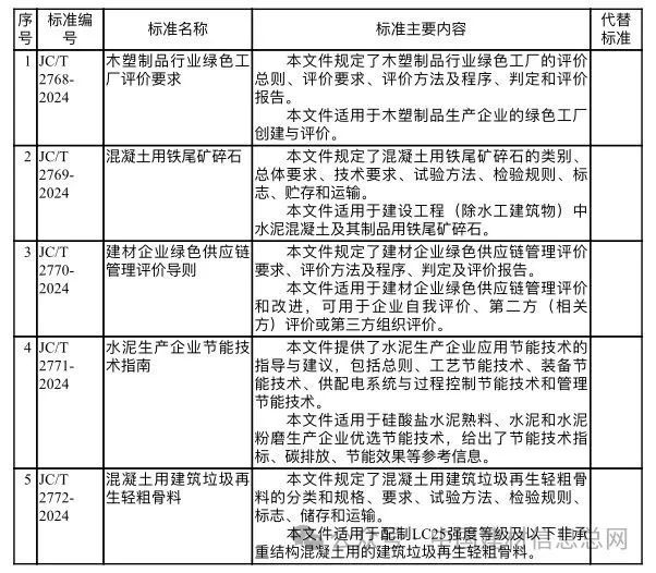 5项建材行业标准名称及主要内容等一览表